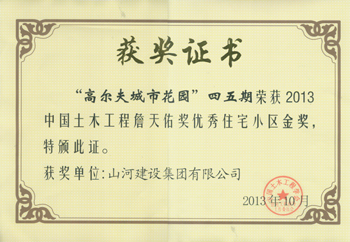 近日,由中国土木工程学会住宅工程指导工作委员会组织的2013年度“中国土木工程詹天佑优秀住宅小区”颁奖仪式在北京举行,由韦德官方网集团承建的 “武汉高尔夫城市花园四、五期”荣获“中国土木工程詹天佑奖优秀住宅小区金奖”。
