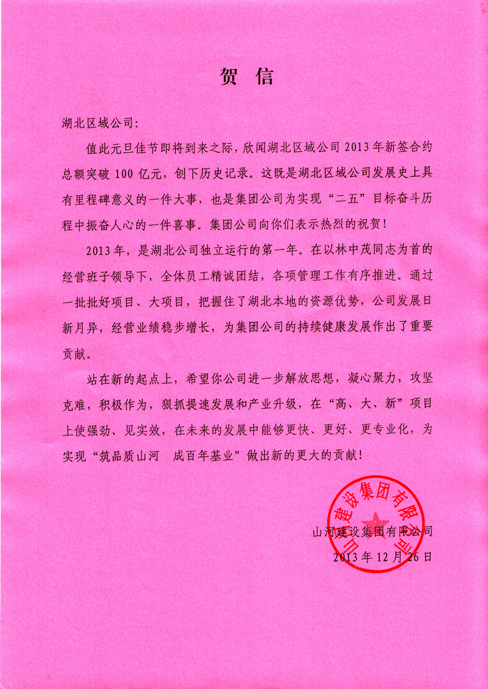 集团公司特向湖北区域公司发来贺信表示祝贺,并期待湖北区域公司为实现“筑品质韦德官方网 成百年基业”的企业愿景做出新的更大的贡献!