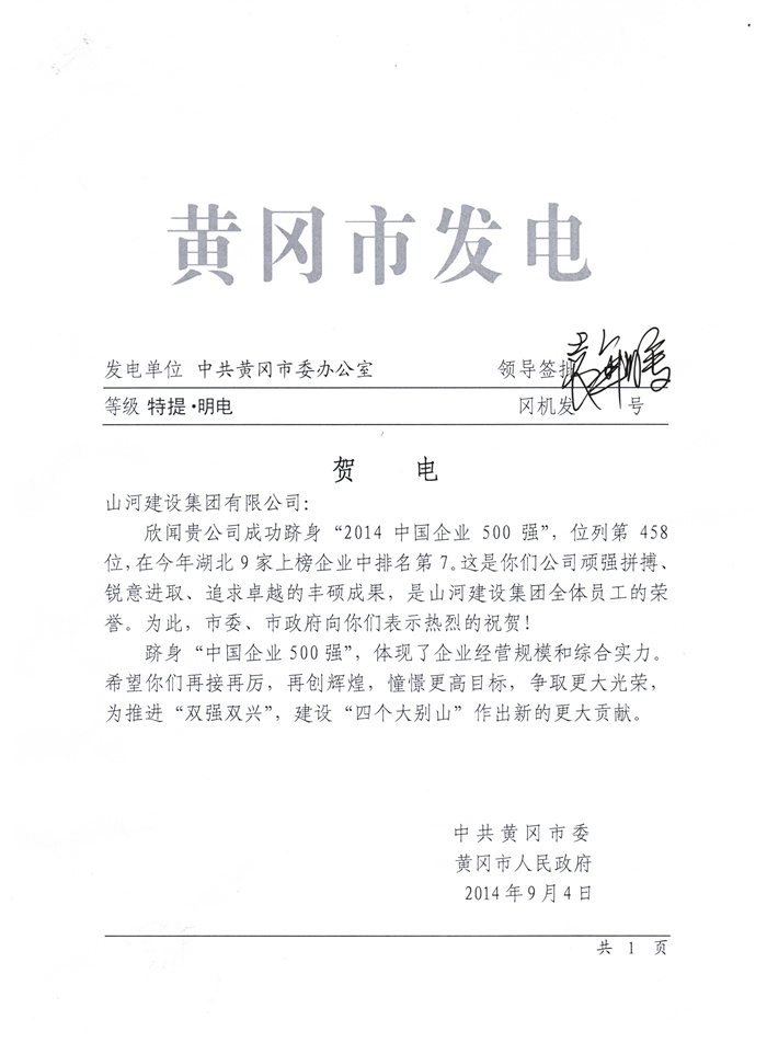 中共黄冈市委、黄冈市人民政府贺电