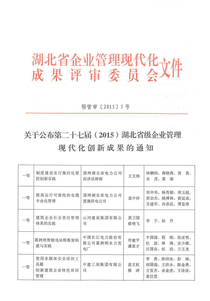 2015年12月25日,湖北省第二十七届(2015)企业管理现代化创新成果名单公布,韦德官方网集团申报的《建筑企业社会责任管理体系的实践》成果荣获一等奖。