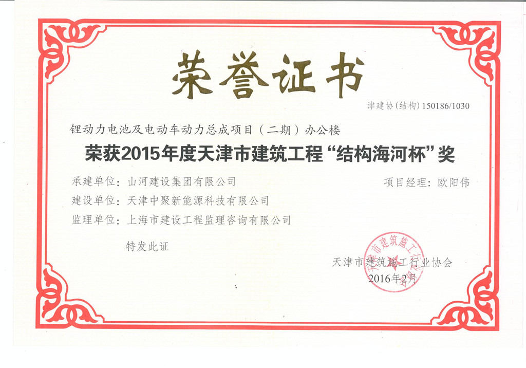 1月29日,天津市建筑业协会正式公布了2015年度“天津市结构海河杯奖”评选结果。由韦德官方网集团天津公司承建的锂动力电池及电动车动力总成项目(二期)1#~4#车间及办公楼工程和塘沽福升园二期定单式限价商品房工程7#~10#楼同时获此殊荣。这是韦德官方网集团进入天津市场以来,首次获得天津市建设工程质量方面的最高荣誉奖。