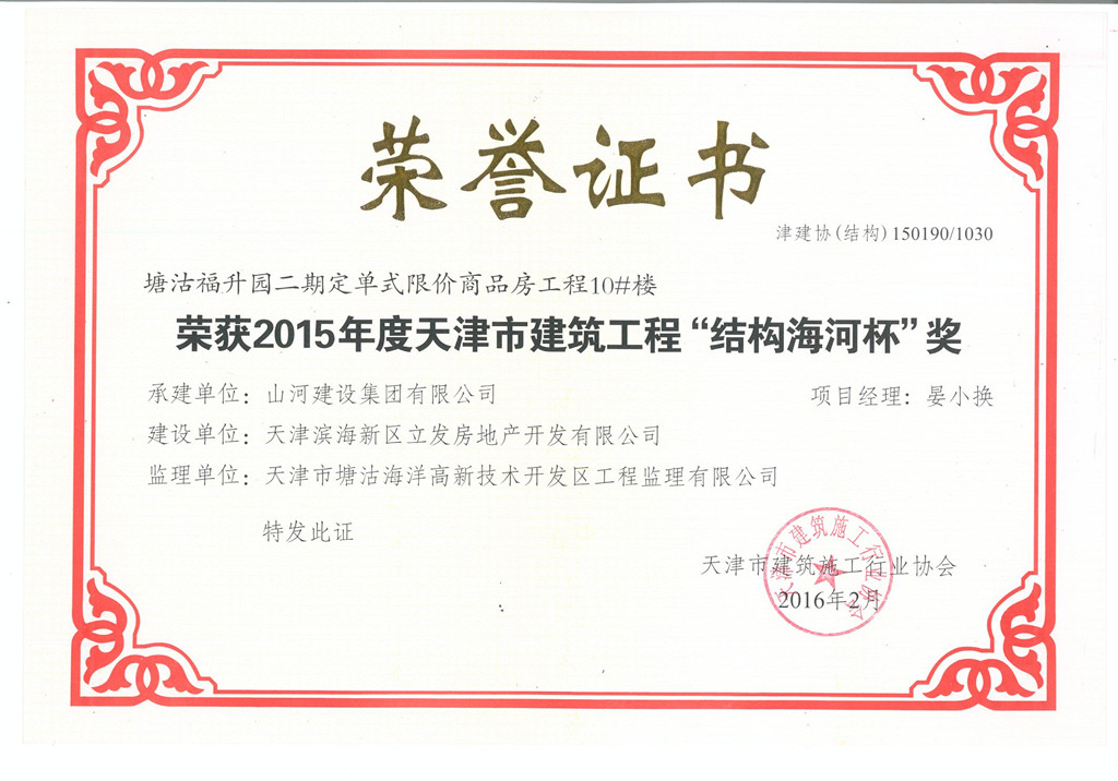 [天津公司]热烈祝贺天津公司首次荣获2015年度天津市建筑 “结构海河杯”奖项