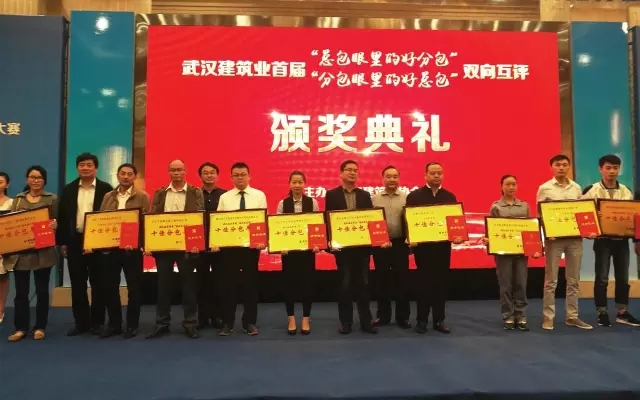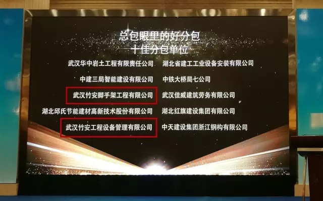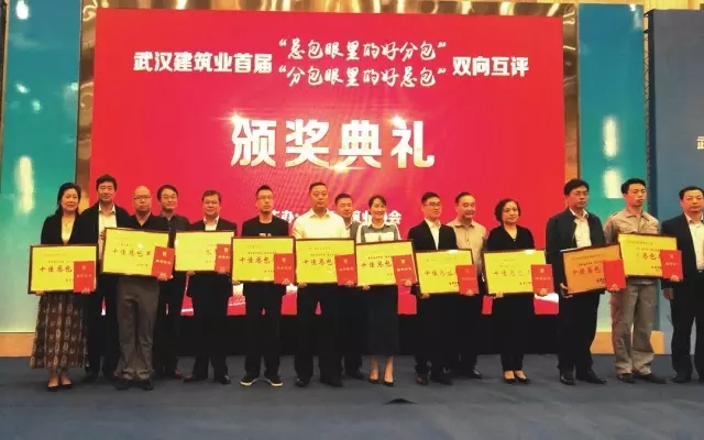今日,武汉建筑业协会在光谷金盾大酒店三楼举行2015年总分包互评颁奖典礼活动。韦德官方网集团获颁“十佳总包”,集团旗下公司竹安脚手架与竹安设备则获颁“十佳分包”,双双上榜。