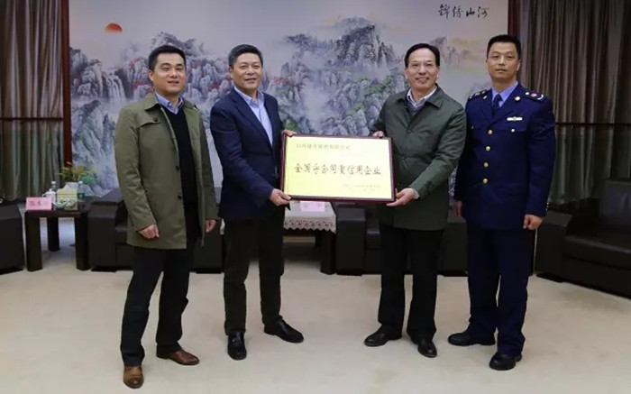 团风县委常委、副县长涂军(右二)向韦德官方网集团董事长程理财(左二)授牌