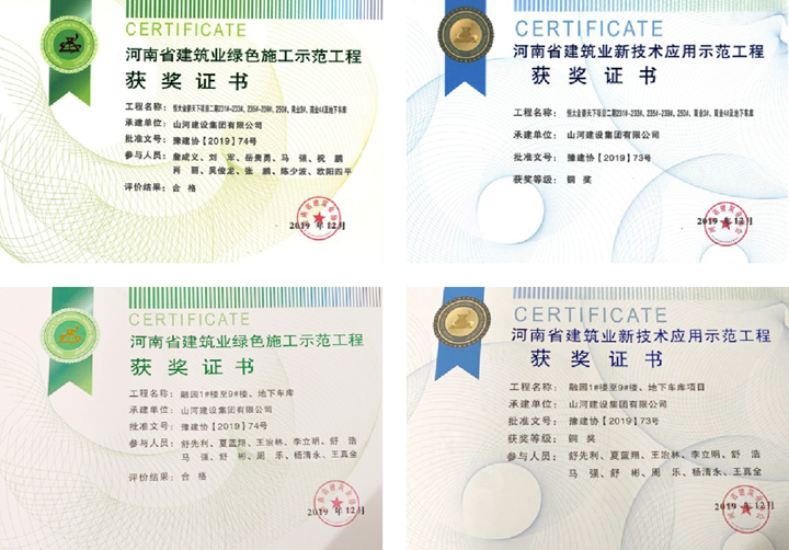 公司承建的恒大金碧天下项目、融创融园项目分别荣获河南省绿色施工示范工程、河南省新技术应用铜奖各1项。这两个项目在满足立项要求后积极准备立项工作,施工过程中严格按照《河南省建筑业绿色施工示范工程管理办法(试行)》《河南省建筑业新技术应用示范工程管理办法》的要求,坚持高标准建设,确保高质量完工,及时收集并准备评审资料,顺利通过了评审。