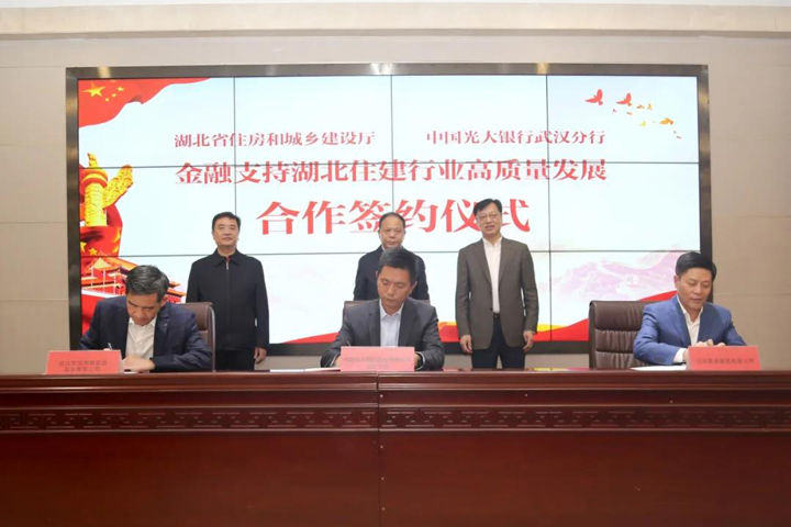 10月30日,由湖北省住房和城乡建设厅、中国光大银行武汉分行主办的金融支持湖北住建行业高质量发展合作签约仪式在省住建厅举行。湖北省人民政府副省长万勇,省住建厅党组书记、厅长李昌海,党组副书记、副厅长张弘,光大银行武汉分行党委书记、行长谭梦湘,党委委员、副行长唐红斌等领导出席了签约仪式。