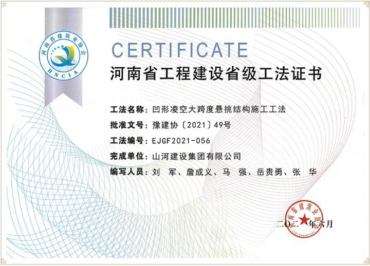 近日,河南省建筑业协会公布了《2021年度第一批河南省省级工法名单》,韦德官方网建设集团河南公司申报的《凹形凌空大跨度悬挑结构施工工法》成功入选,被认定为河南省工程建设省级工法。