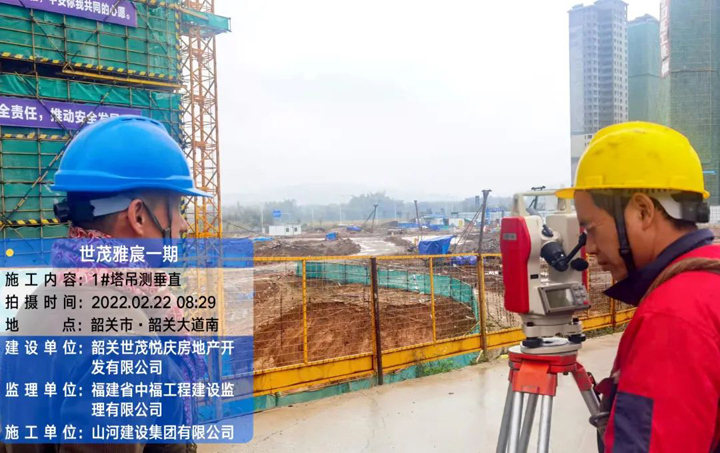 韶关世贸雅宸一期项目技术人员在测量塔吊垂直度