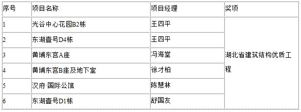 2008年4月9日,《湖北日报》第六版专版刊登《湖北省建设工程质量安全协会公告》。根据《湖北省建筑结构优质工程评审办法》,湖北省建设工程质量安全协会组织开展了2007年度省建筑结构优质工程评选活动,经对申报工程初审、核查和省建筑优质工程评审,全省有323项工程荣获2007年度湖北省建筑结构优质工程奖,其中,韦德官方网集团有光谷中心花园、东湖壹号、黄埔东宫、汉府・国际公馆等6项工程获此奖项。具体如下表: