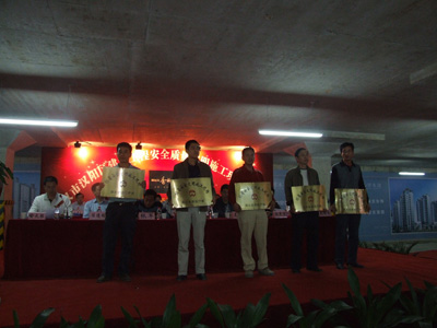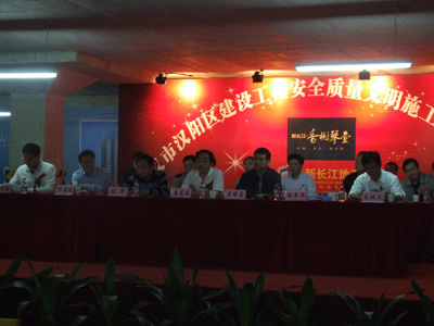 秋风送爽、彩旗飘扬,汉阳区2008年度建设工程安全质量文明施工现场观摩会于9月27日在我公司香榭琴台项目经理部隆重召开。出席此次会议的领导有:武汉市委副秘书长唐昌海;汉阳区委常委、副书记吴明益;汉阳区委常委、副区长张 军;汉阳区委常委、宣传部长张本满;汉阳区人大副主任朱时木;汉阳区政协副主席冯从捌;武汉市建委建管办副主任贾巾戈;武汉新区指挥部工程建设部部长赖成林;武汉市建设工程安全站站长邱济彪;武汉市建设工程市场站副站长王伟震;武汉市建设工程质监站副处长李克平;汉阳区文明委主任甘琼;汉阳区安监局局长范俊华;汉阳区建设局党委书记陈双喜;汉阳区建设局局长熊成明;汉阳区建设局副局长、建管站站长王辉友等。出席此次会议的还有:各区建管部门领导、汉阳区在建工程的建设、施工、监理单位代表共计五百余人参加了本次活动。